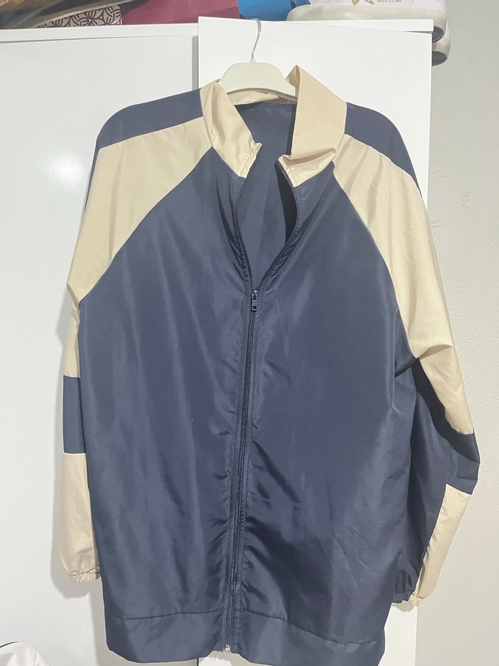 Gri ve mavi tonlarda, yüksek yakalı, uzun kollu ve fermuarlı, bol kesim kadın ceket. Pürüzsüz sentetik kumaştan, rahat sokak stili için uygundur.