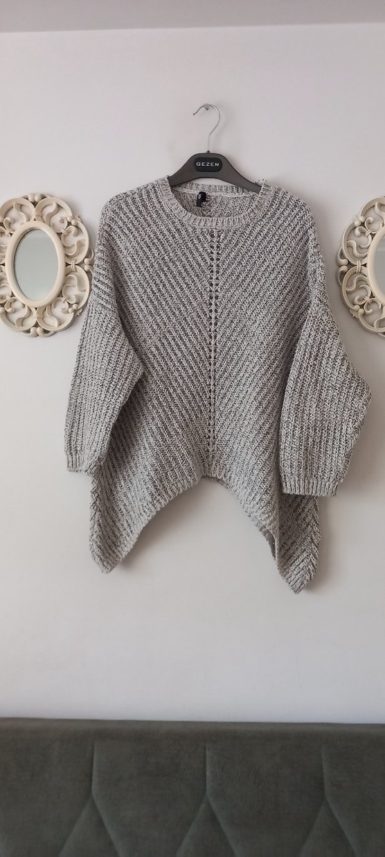 Gri melanj renkte, orta uzunlukta ve regular fit kesime sahip triko kazak. Cozy luxe dokusu ve M beden Defacto markadır.Cok az kullanıldı tuylenmesi yoktur.