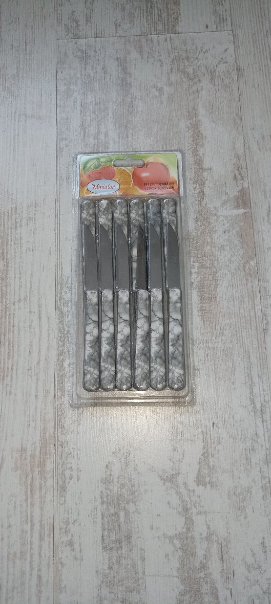 Gri mermer desenli saplara sahip 12 adet bıçak içeren, kullanışlı ve şık bir set.
