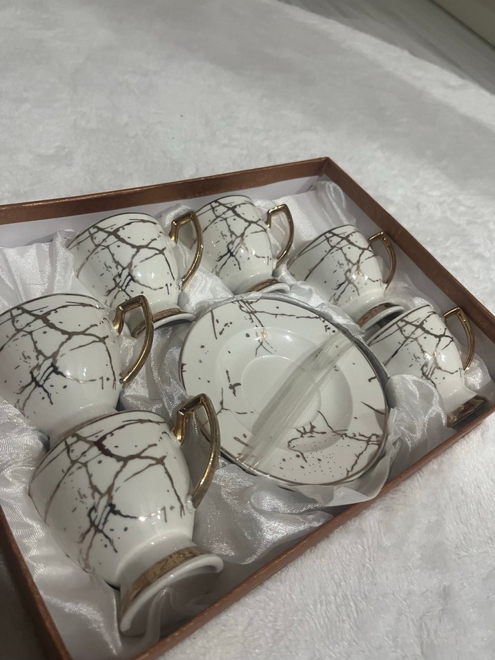 Altın saplı, gri mermer desenli beyaz 6 kahve fincanı ve tabak seti. ☕
