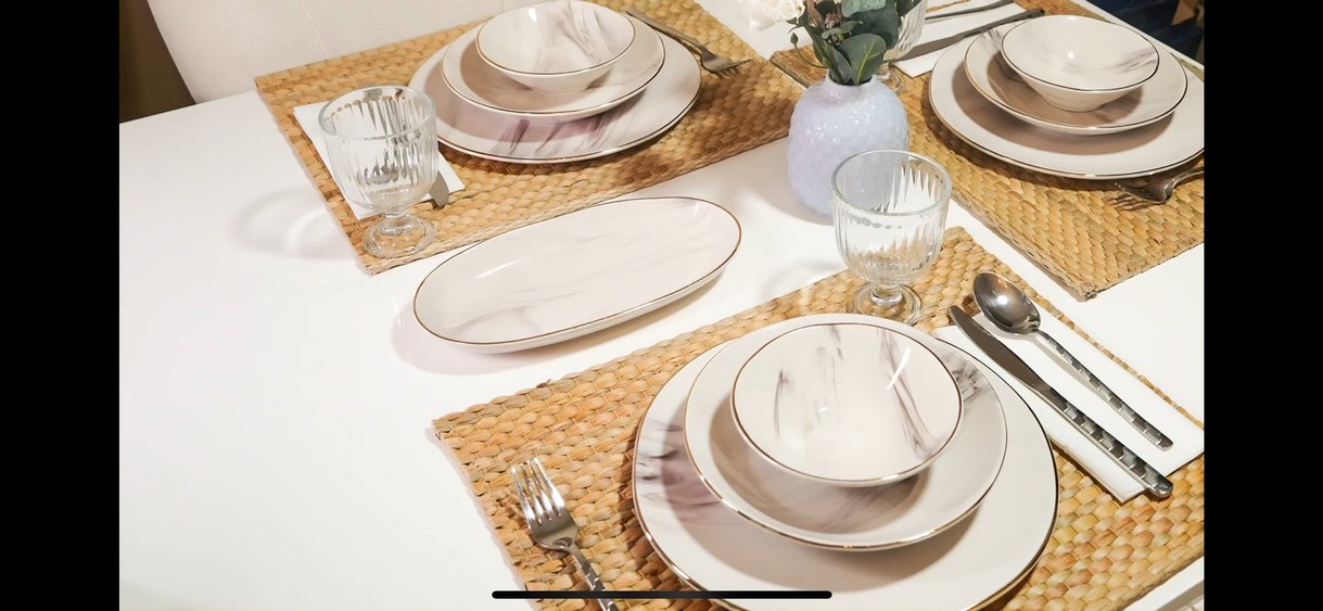 Gri mermer desenli ve altın detaylı beyaz saklama kapları, yiyecekleri güvenle saklamak için uygundur. 6 kişiliktir 2 kayık ve 1 adette salata kasesi bulunmaktadır. 4 adet tabakta fotoğrafta göründüğü gibi sıyrıklar dışında bir sıkıntı yoktur. Marka temsili