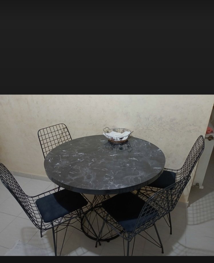 Gri mermer desenli yuvarlak masa, siyah tel çerçeveli sandalyeler ve kareli minderlerle tamamlanmıştır. Modern yemek alanları için uygun. ️Kocaeli ici elden teslim sadece.
