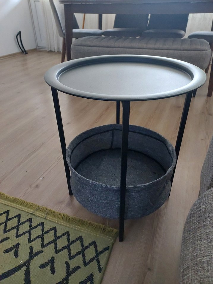 Gri metal üst tabla ve alt kısmında saklama için gri kumaş sepet bulunan, üç metal ayaklı yuvarlak sehpa. Eşyalarınızı düzenlemek için kullanışlı.