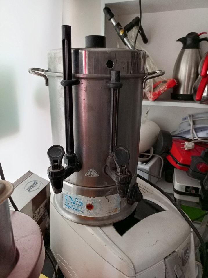 Bu gri metal çay makinesi, kolay servis için çift musluk ve kulplara sahiptir. Kompakt tasarımı farklı alanlara uygundur. ☕
