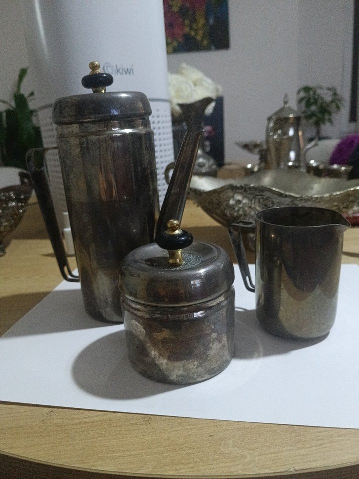 Gri metalden yapılmış, vintage görünümlü uzun çaydanlık, şekerlik ve küçük sütlükten oluşan set. ☕