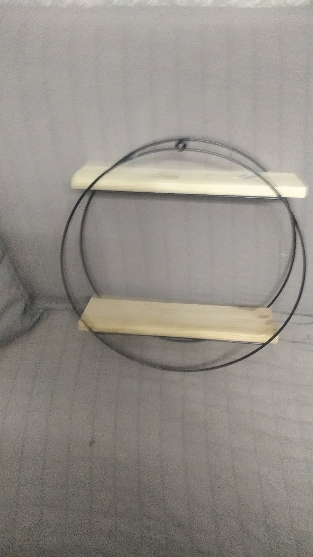 Yuvarlak gri metal çerçeve ve iki bej ahşap raflı çocuk rafı, sade ve işlevsel depolama sağlar.
