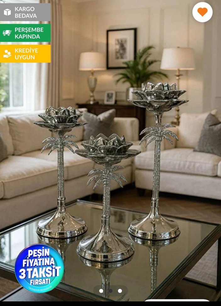 Çiçek şeklinde tasarlanmış, gri metal malzemeden yapılmış üçlü mumluk setidir. Ev dekorasyonuna şıklık katar. Evime hediye gelmişti fakat oturma odamın tarzına uymadığı için hiç kullanamadım ve satışa koyuyorum. Trendyoldaki güncel fiyatı da görseller arasında yer almaktadır. kutulu bir şekilde teslim edilecektir.
