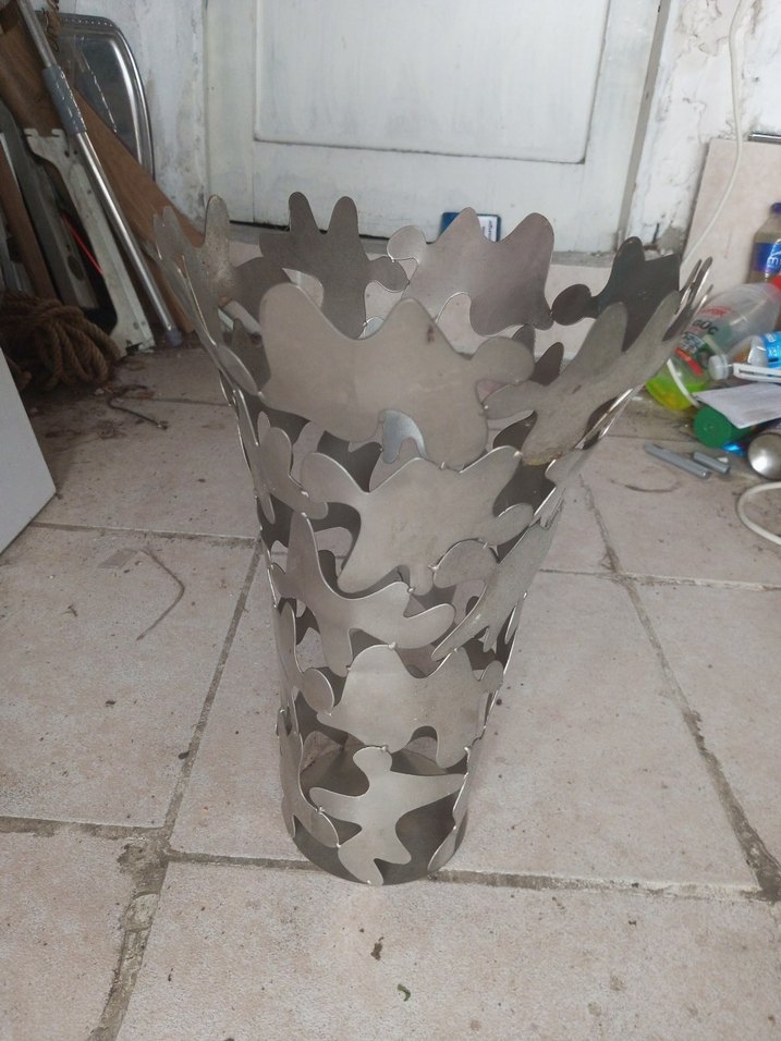 Gri metalden yapılmış, soyut kesim desenlere sahip dekoratif vazo, modern ve sanatsal bir görünüm sunar. Sağlam yapısıyla mekana şıklık katar.