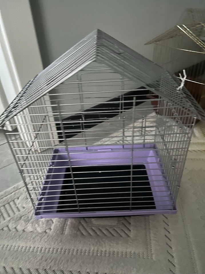 Küçük ev şeklinde gri metal kafes, küçük evcil hayvanlar için uygundur. Tel çerçeveli ve mor plastik tabanlıdır.