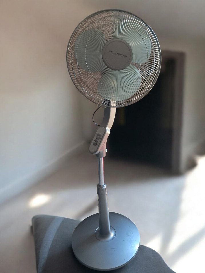 Gri metal gövde ve koruyucu ızgaraya sahip masaüstü vantilatör, ayarlanabilir hız seçenekleri ve sağlam taban sunar. ️