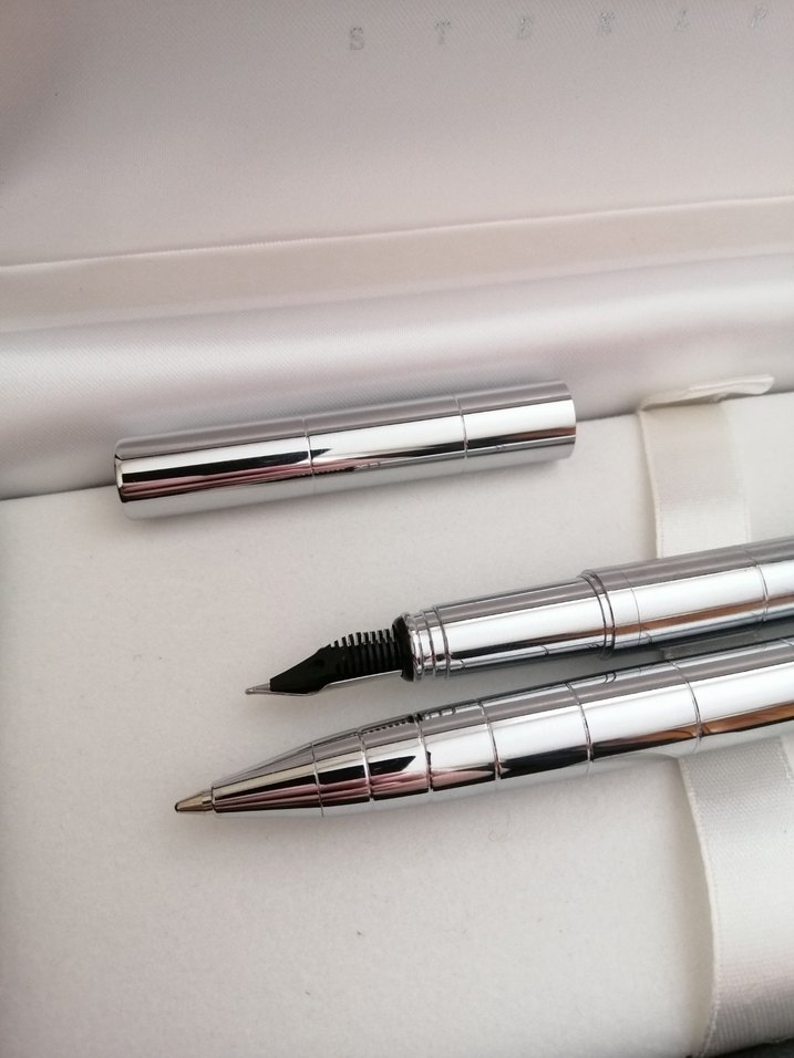 Gri metal malzemeden yapılmış, rahat yazım sağlayan dolma kalem ve tükenmez kalem seti. Sıfır ürün ✒️