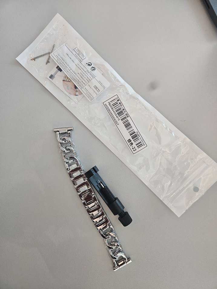 Gri metal zincir tasarımlı erkek saat kayışı, kolay montaj için araçlarla birlikte gelir. Dayanıklı yapısıyla nostaljik bir görünüm sunar. ⌚