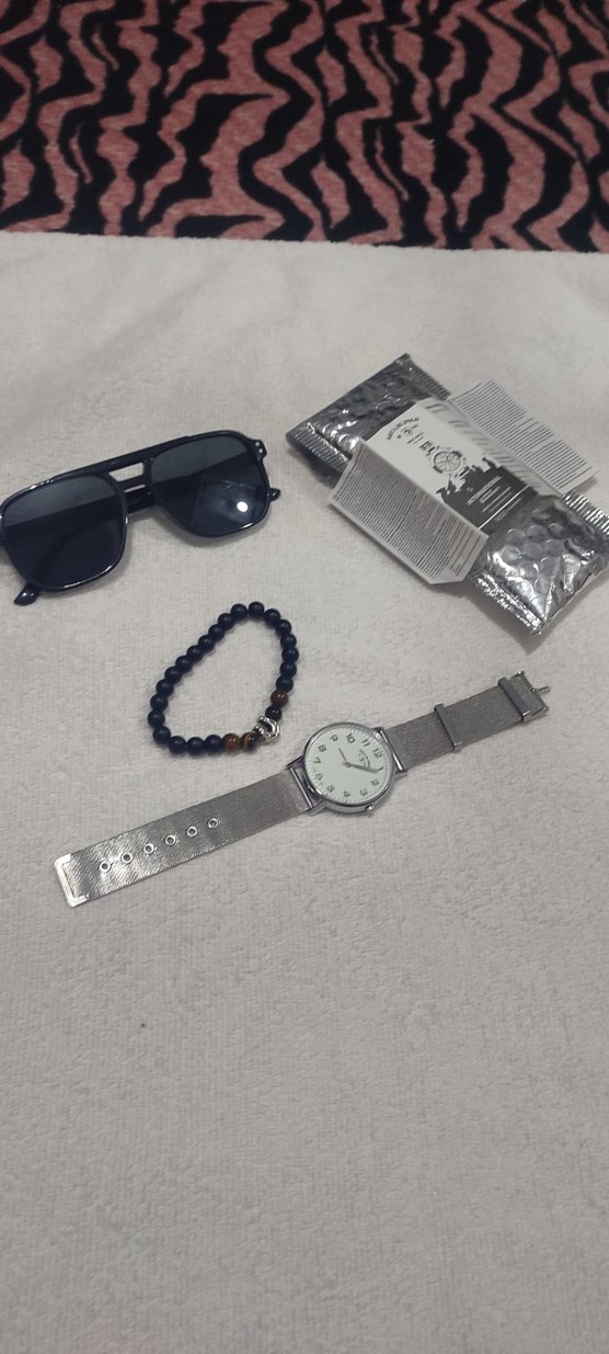 Gri metal kordona sahip saat ve baskılı desenli boncuklu bileklik. Set, koyu renk güneş gözlüğü ve tarak içerir. ⌚
