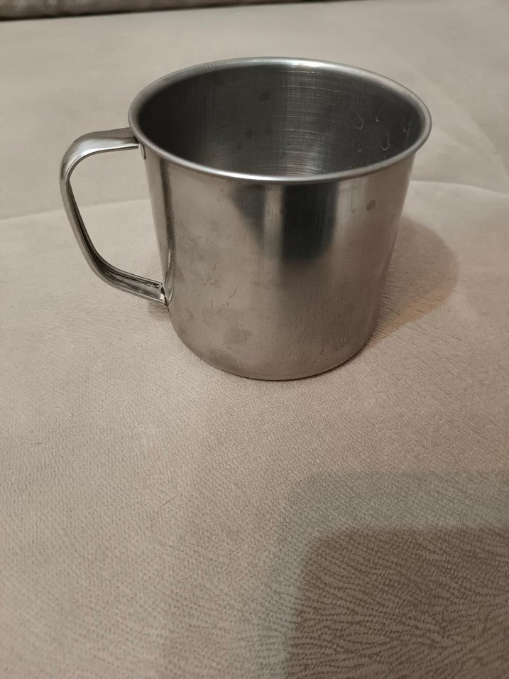 Gri metal kulplu çelik kupa, sıcak ve soğuk içecekler için uygundur. Dayanıklı ve temizlemesi kolay. ☕