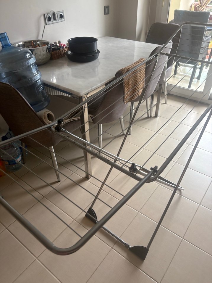 Gri metalden yapılmış bu kurutmalık askıda çoklu çubuklar bulunur.