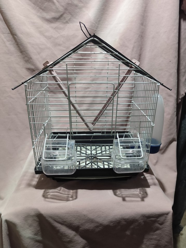 Gri metal kuş kafesi, çatılı ve önünde iki şeffaf yemlik bulunan küçük kuşlar için uygun alan sağlar.