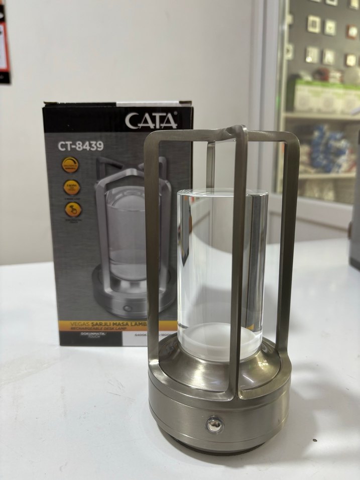 Gri metal gövde ve şeffaf silindirik cam gölgelik içeren CT-8439 model masa lambası. Modern kafes tasarımlıdır.