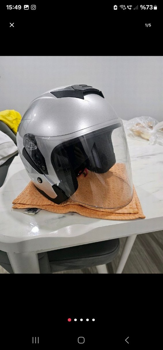 Gri metal motosiklet kaskı, şeffaf vizör ve güvenli tutuş için Velcro bant içerir. Minimalist tasarım, rock punk havası taşır. ️