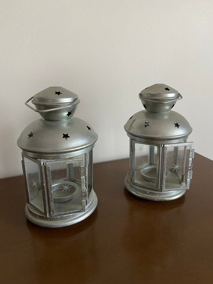 Yıldız desenli kesimlere ve açılabilir cam panellere sahip iki adet gri metal mumluk seti. Rustik, vintage görünümlü ve üstlerinde küçük kulplar bulunur. ️