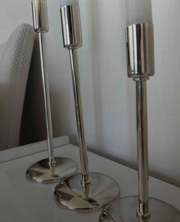 Parlak gri metalden yapılmış, ince mumlar için uygun üçlü mumluk seti. ️