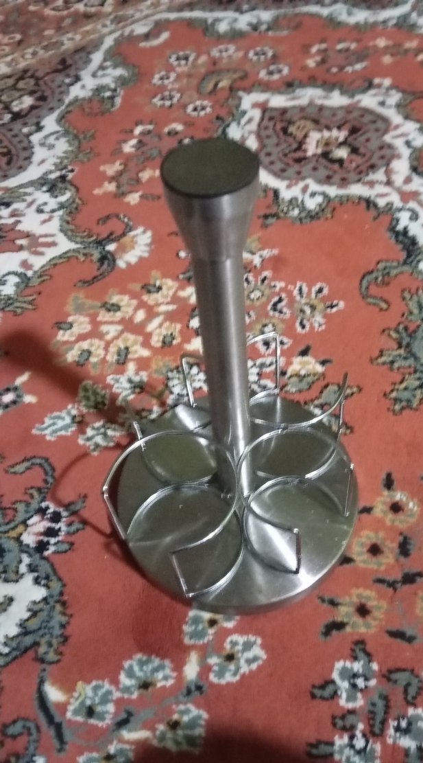 Gri metal mutfak aksesuarı, ortasında sap ve birkaç yuvarlak tutucu ile küçük eşyaları düzenlemek için uygundur.