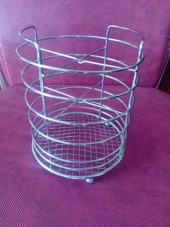 Gri metalden yapılmış, mutfak gereçleri için düzenleyici sepet. Açık tel yapısı sayesinde kolay erişim sağlar.