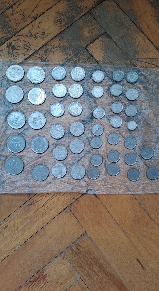 Farklı boyut ve tasarımlarda gri metal paraların ahşap yüzey üzerine dizili koleksiyonu.