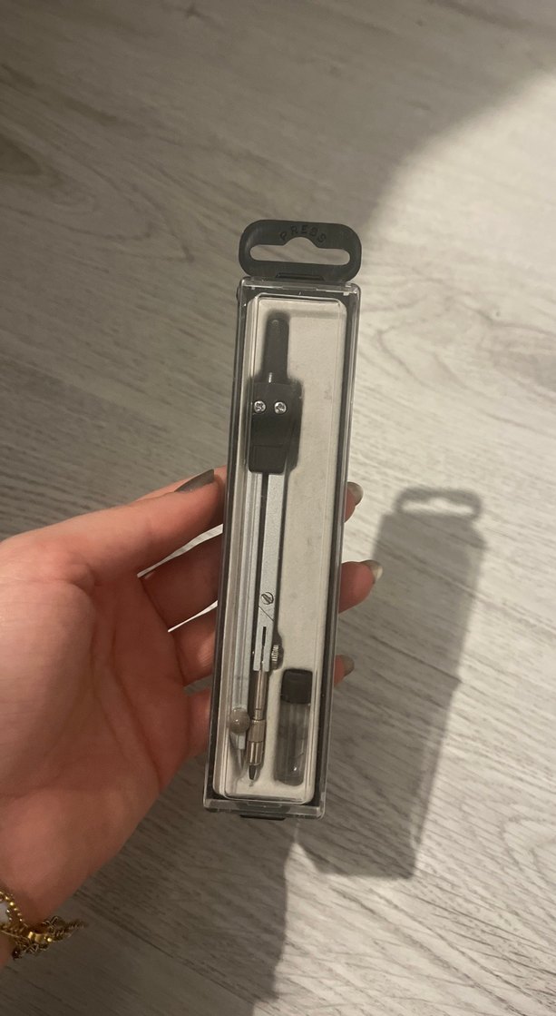 Gri metal pergel seti, kalem tutucu ve küçük bir kalemtıraş içerir, hassas çizim ve ölçüm için uygundur. ✏️