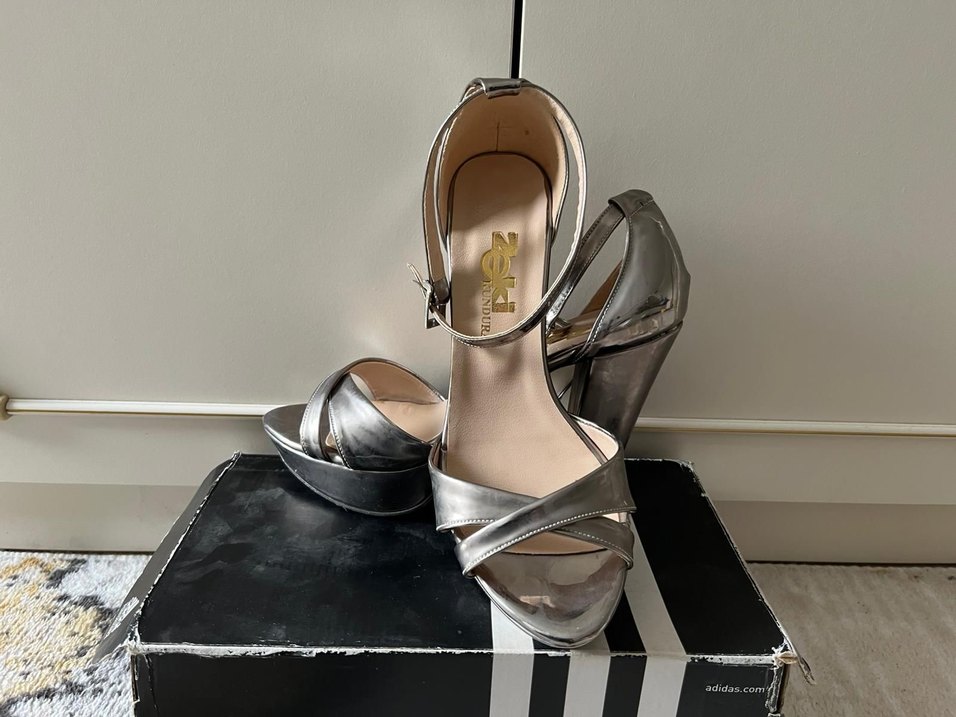 Gri metalik görünümlü ve yılan desenli kadın abiye ayakkabılar. Platform topuklu ve tokalı, romantik akşamlar için uygundur. ✨