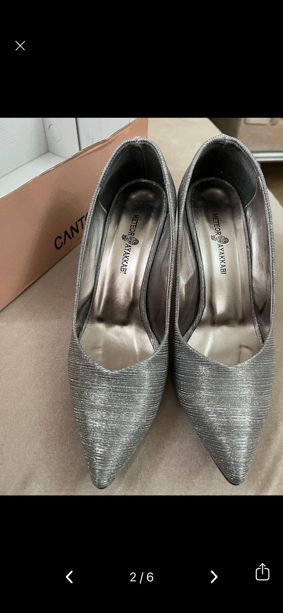 Gri metalik dokulu, pliseli stiletto topuklu abiye ayakkabılar, düğün için çağdaş ve şık bir görünüm sunar. Desensiz ve klasik zarafeti yansıtır. Topuk 8cm bir kez giyildi düğünde