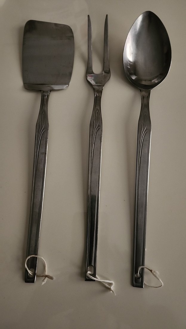 Uzun saplı koyu gri metal servis kaşığı, çatal ve spatula seti. Dayanıklı mutfak gereçleri.