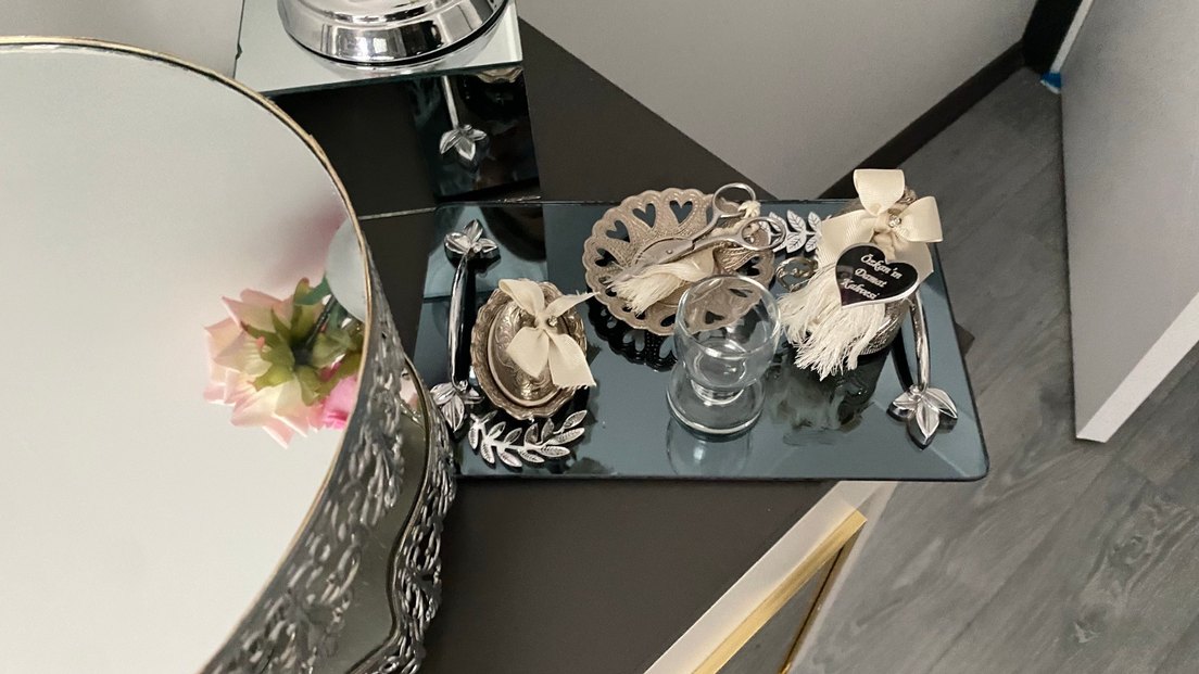Kalp desenli tabak, makas ve küçük cam bardak içeren gri metal tepsi seti. Şık sunum veya dekorasyon için uygundur. İhtiyacım olmadığı için satışa sunuyorum