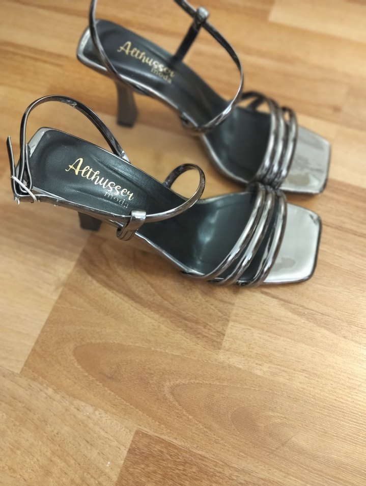 Gri zebra desenli metal stiletto topuklu kadın ayakkabıları, tokalı kayışıyla klasik ve modern bir şıklık sunar. YALNIZ 1 kere giyildi