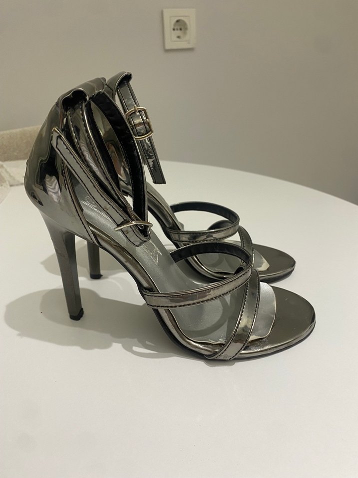 Gri ymetal stiletto topuklu, tokalı kayışlarla. Cesur ve göz alıcı tarzı ile romantik akşamlar için uygun.