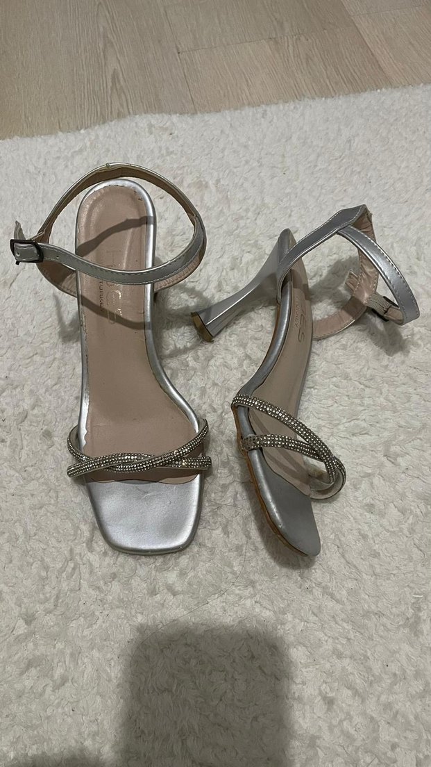 Gri renkte, metalik görünümlü ve yılan deseni detaylı stiletto topuklu, tokalı abiye ayakkabılar. Düğün gibi özel anlara uygundur.