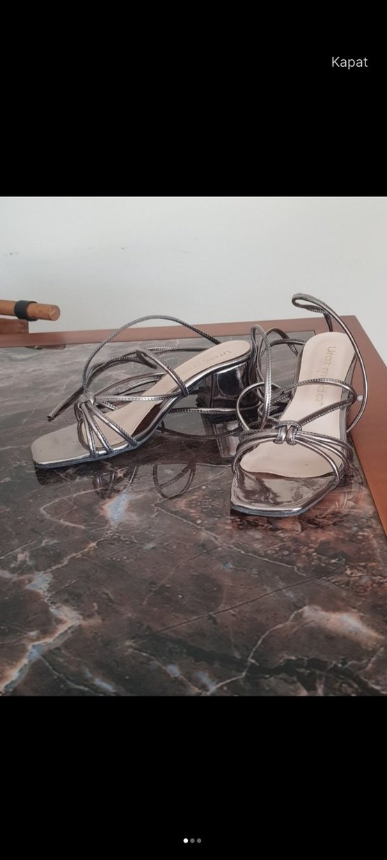 Gri metal malzemeden, yılan derisi desenli, tokalı kayışlara sahip blok topuklu kadın ayakkabısı. Paris tarzında, günlük kullanıma uygun şık model. mezuniyetimde giydim sadece
