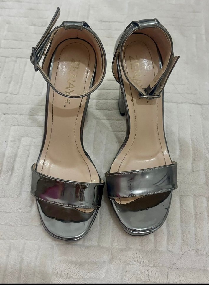 Gri metal görünümlü, tokalı bilek kayışlı blok topuklu kadın ayakkabısı. Minimalist ve çağdaş tasarıma sahip, yılan derisi desenli, günlük kullanıma uygun.