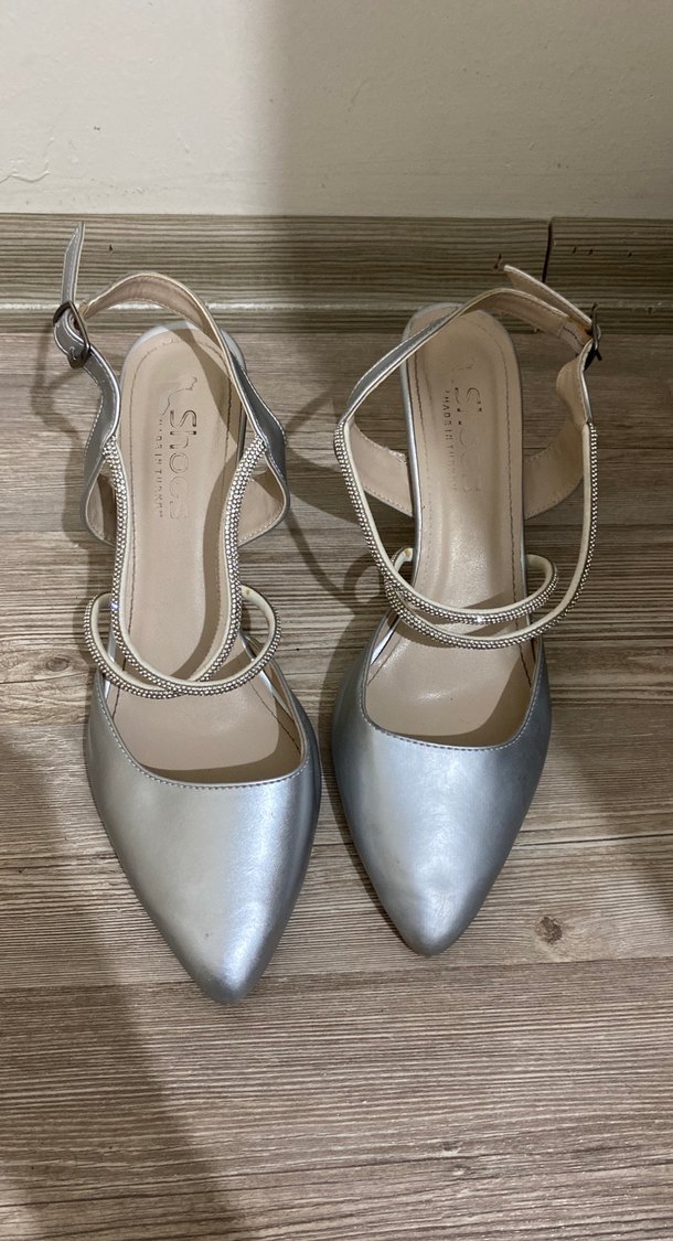 Gri renkte, metal tokalı ve ince topuklu, sade ve çağdaş tasarıma sahip abiye ayakkabılar.