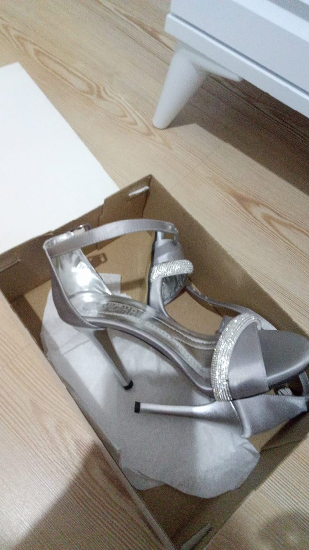 Gri metal malzemeden yapılmış, tokalı ve ince topuklu kadın abiye ayakkabısı. Düğün ve özel geceler için uygundur.