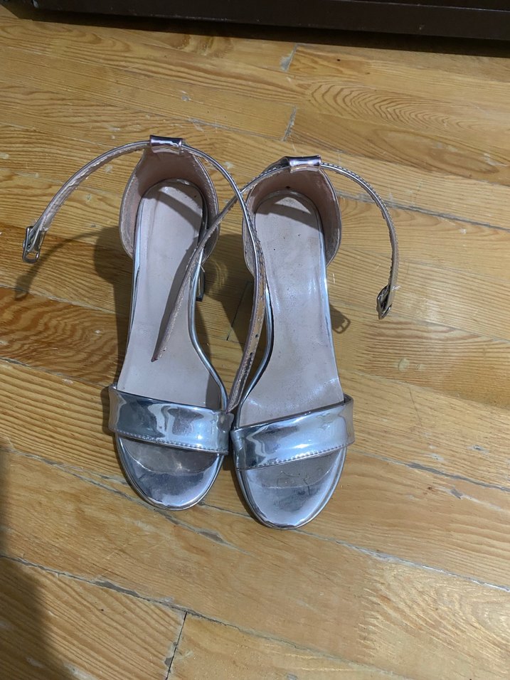 Gri parlak metal malzemeden yapılmış, tokalı ince topuklu kadın ayakkabısı, düğün için uygundur.