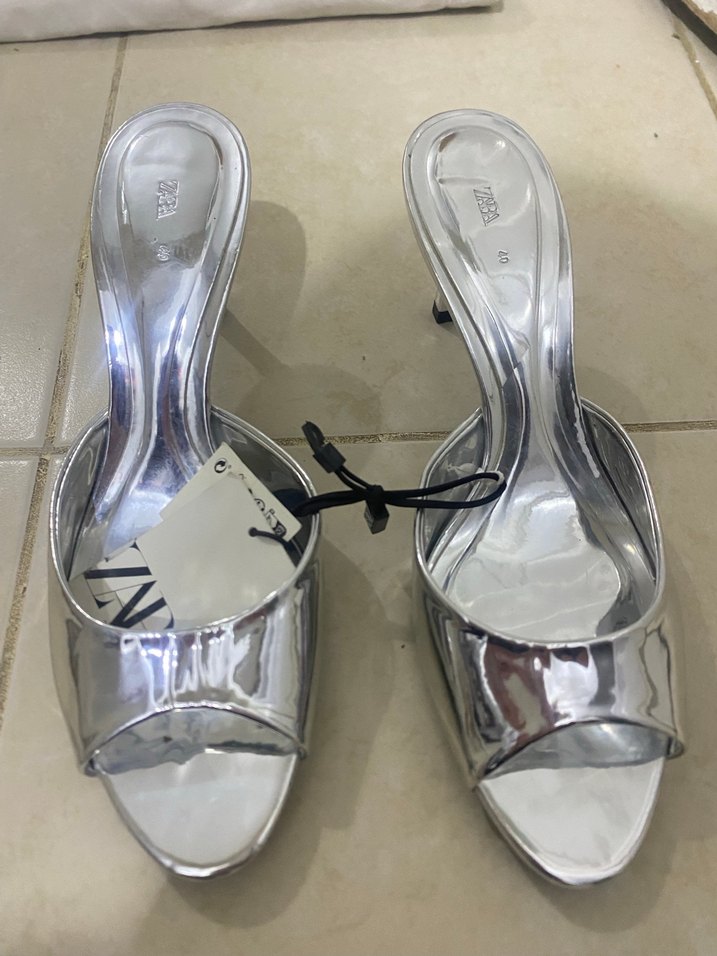 Gri metal görünümlü ince topuklu kadın terlik, tokalı ve desen içermeyen modern bir tasarıma sahiptir.
