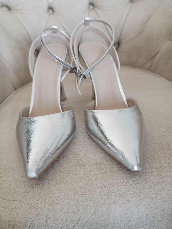 Gri metal tokalı stiletto topuklu kadın abiye ayakkabı, çağdaş minimalist tarzda, düğün için uygun. sadece nişan için 4-5 saat kullanıldı