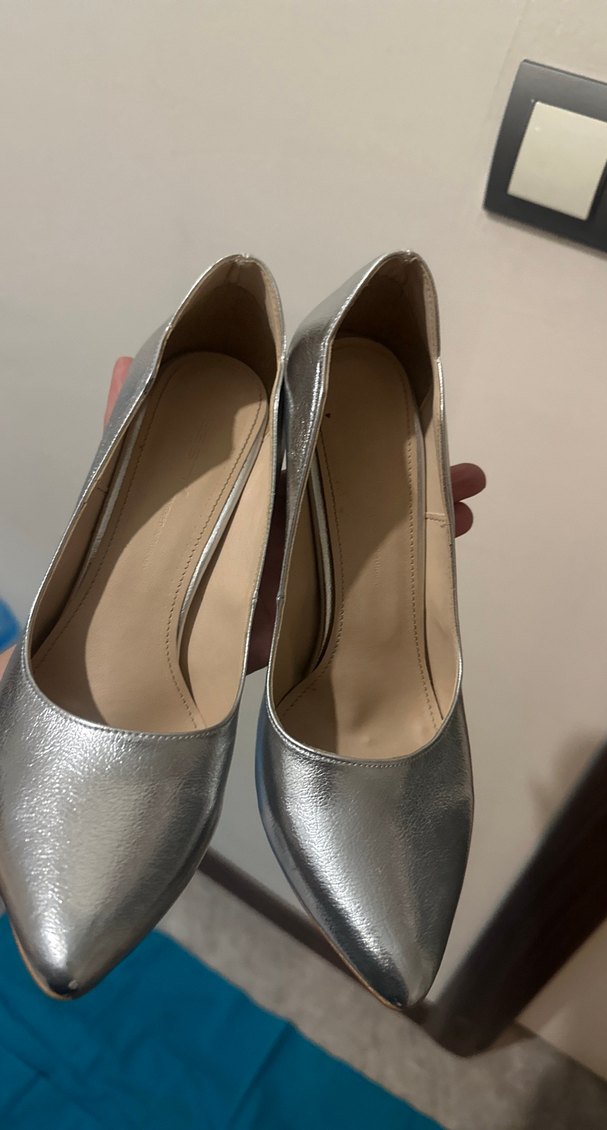 Gri metal görünümlü, tokalı stiletto topuklu kadın ayakkabısı, çağdaş ofis şıklığı için uygun.
