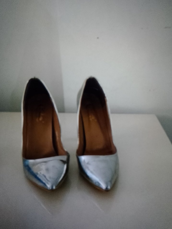 Gri metalik yüzeye sahip, tokalı kadın stiletto ayakkabılar. Minimalist ve çağdaş tasarımıyla ofis kullanımı için uygundur. Sivri burun ve ince topuklu.