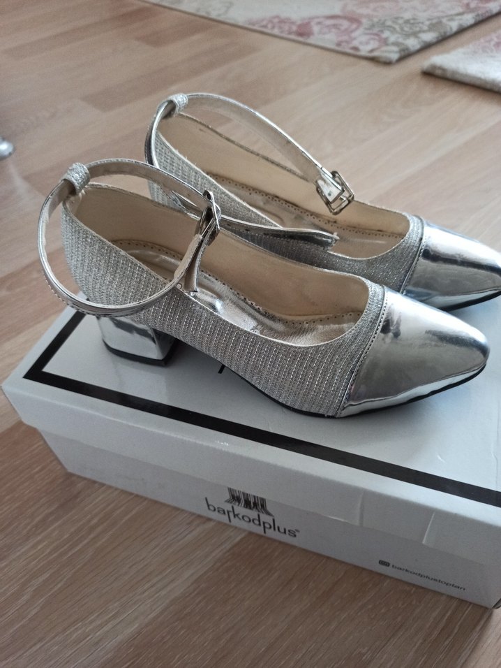 Gri metal bilekten tokalı, simli, kısa topuklu kız çocuk ayakkabısı. 34 numara 2 kez giyildi iyi durunlu