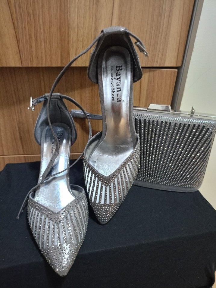 Gri metalik tokalı, yılan desenli yüksek topuklu kadın abiye ayakkabılar ve uyumlu taşlı çanta, düğün için uygundur. ayakkabı,nın topuk kısmında arabadan inerken kapısına çarptı son resimde belirtildi çok yakın çektim,normalde belli bile olmuyor