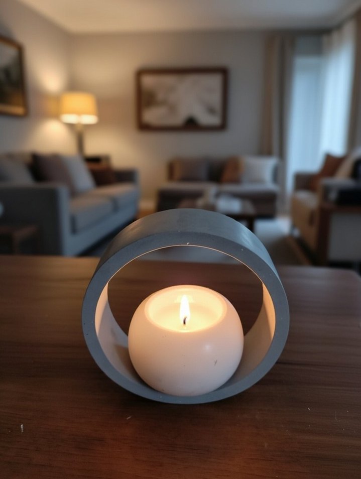 Gri metal yuvarlak mumluk içinde beyaz yuvarlak mum, sıcak bir ortam yaratır. ️