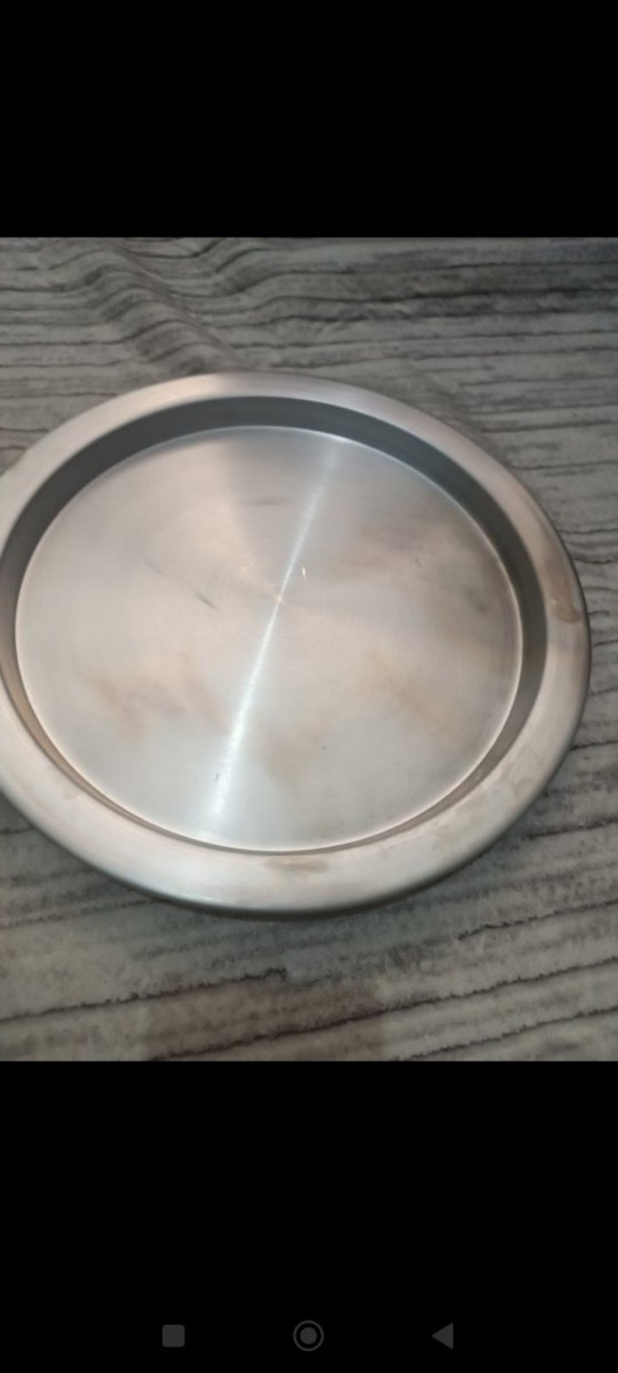 Yuvarlak, gri paslanmaz Tepsi desensiz ve sade tasarıma sahip, farklı masa düzenlerine uygun. ️