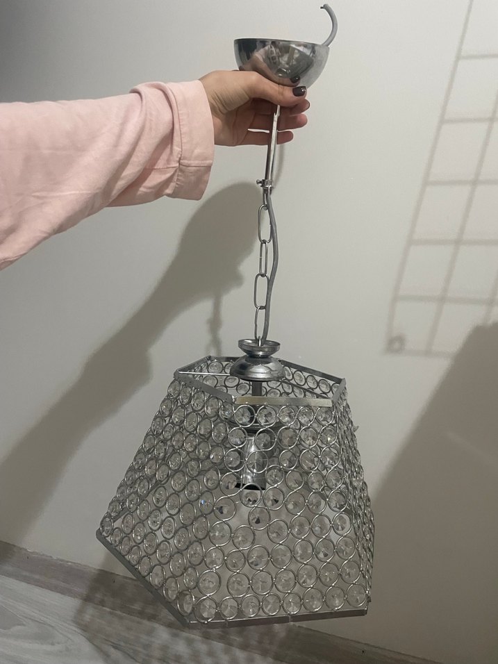 Gri metalden yapılmış, zincirli ve altıgen çerçeveli avize. Dairesel detaylarıyla modern bir hava katar.