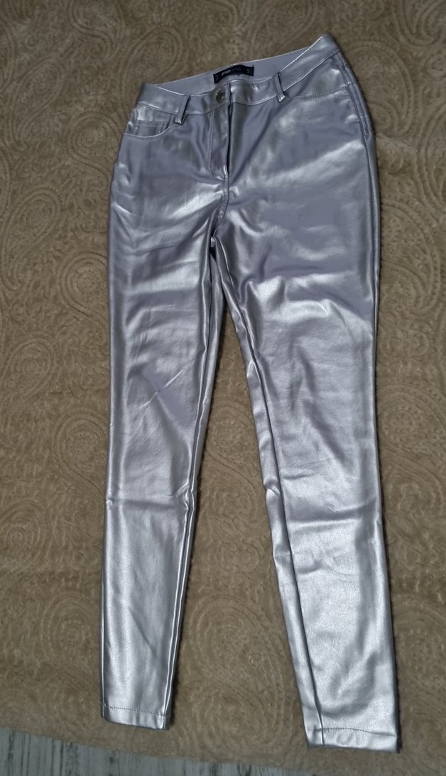 Gri metalik deri kumaştan, dar kesim kadın pantolon, sokak stili ve parti için uygun. ✨